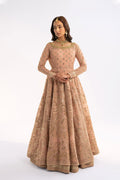 This light pink Anarkali exudes soft elegance and charm. The round neckline is delicately embellished, adding a subtle sparkle, while bold borders on the sleeves and hem make a refined statement. The frock has an airy organza lining, layered over a fitted silk corset inner for a perfect silhouette. It’s paired with a flowing silk lehenga featuring a stylish border for added depth. The net dupatta completes the look with a detailed border and embroidered floral accents, giving the ensemble a fresh, modern appeal.