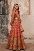 A hot pink Lehnga with intricate bronze and gold embroideries.This hot pink is curated with vibrant yellow florals. Featuring hand embellishment and zardozi. Accompanied by richy embroided , hand embellished dupatta and choli.