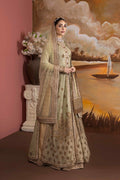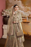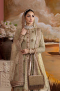 An emerald to remember! An exquisite mint green front open long jacket shirt enriched with crystals & zardozi work paired with nude color jamawar lehnga along with a beautiful goshi colored net dupatta. Beautifying the Mint Green for you!