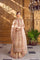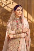 A decadent blush pink colored machine embroided luxury ensemble handcrafted with intricate details in zardozi on a net base, paired with a complimenting beautifully hand embellished organza duapatta, jamawar palazzo pants and corset, finished with signature in house finishes and jamavar chatapatti perfect to be worn as a formal for your wedding functions.