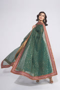 Behold, a sartorial masterpiece draped in the opulence of bottle green silk. This exquisite shirt boasts a captivating symphony of six panels adorning both the front and back, culminating in a breathtaking five-yard flare that cascades elegantly. Intricate zardozi embroidery graces the neckline and bicep motifs, whispering tales of ancient artistry. Accompanying this regal ensemble is a pair of pure silk Culottes, their embroidered bottoms hinting at whispers of movement beneath. And to crown this symphony of luxury, a diaphanous net dupatta, richly embroidered and adorned with a captivating border, flutters with the promise of untold stories. This is not merely an attire; it is an embodiment of grandeur, a whispered promise of luxury, fit for the most discerning connoisseur.