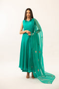 Description: A captivating asymmetrical teal dress, expertly draped with a subtle side slit, harmoniously coordinated with pure raw silk azar pants. Enhance the ensemble with a pure organza dupatta beautifully adorned with fish-shaped motifs.