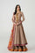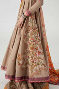 A long-sleeved Anarkali-style dress. The dress features intricate embroidery around the neckline and down the front. There are also small, scattered floral motifs embroidered on the bodice and skirt. The hemline of the dress has a purple banarsi and embroidered border, paired with crushed pants finished with orange banarsi, printed dupatta on silk. The dupatta has a detailed floral and paisley pattern in shades of orange, pink, and green, finished with banarsi and embroidered borders. Perfect for any festive occasions Stitched Includes Pishwas ( Fabric : Premium Lawn | Length : 56 Inches )