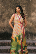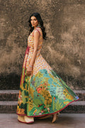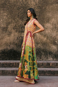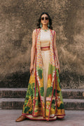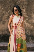 This sleeveless wrap-style jacket exudes effortless charm with its vibrant floral upper and scenic mughal miniature inspired landscape lower print. Paired with flowy sharara pants and a sleek tank top, it creates a striking fusion of tradition and contemporary elegance. The contrast piping and tie-up detail add a refined finish, making it perfect for different occasions.