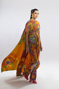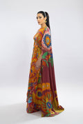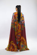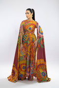 Floor-length dress elegantly draped in a floral print, accompanied by sleeves that gracefully cascade in a draped fashion.