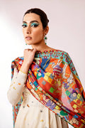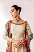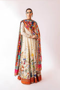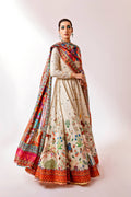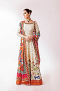 A portrayal of Mughal history through printed Lawn fabric. The ensemble includes a floor-length pishwas, a printed lawn dupatta, and plain pants . The neckline is adorned with naqshi, dabka, and diamontis embellishments.