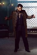 A tropical woven base fully embroidered in a traditional straight cut Sherwani with a gold and vintage hand embellished band collar, vintage metallic thread and sequin embroidery all over. This Sherwani is paired with a silk under suit and pants.