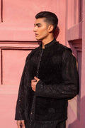 FahadHussayn presents 'Chanesar', a set of elegant black waistcoat paired with Kurta Pants. The waistcoat is rendered with silver ada and embroidery work along with threadwork on the kurta and plain pants to dignify the look.