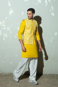 yellow cotton embroidered sleeveless waistcoat with embroidered band & hidden placket