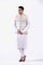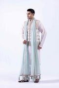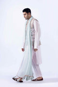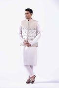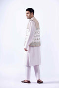 Geometric embroidered waistcoat with Goshi zardozi, crystal, and resham work paired with Korean raw silk kurta and pants with cotton karandi patka finished with embroidered border and tussles on the corner and embroidered turban.