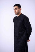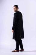 A striking black chiffon kurta adorned with exquisite black zardozi embroidery along the neckline and elegantly lined with chiffon on the front panel. This sophisticated ensemble is paired harmoniously with korian raw silk pants, creating a seamless blend of style and comfort. Completing the look is a chiffon patka featuring a beautifully embroidered border and charming tassels, adding a touch of grace and elegance to the outfit.