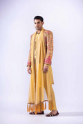 Indian raw silk tribal multi-embroidered raja coat finished with maroon velvet and embroidered border paired with Korean raw silk kurta with antique zardozi work on neckline and handmade custom buttons and Korean raw silk pants and chiffon patka with all over the embroidered border and handmade tussles and accessorized with embroidered turban with zardozi work finishing.