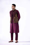 Indian raw silk tribal multi-embroidered raja coat finished with pink velvet and embroidered border paired with Korean raw silk kurta with antique zardozi work on neckline and handmade custom buttons and Korean raw silk pants and chiffon patka with all over the embroidered border and handmade tussles and accessorized with embroidered turban with zardozi work finishing.