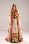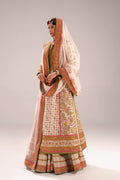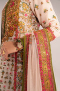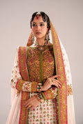 Elegant ivory Ensemble three-piece traditional outfit, a long Kurta with a sharara rendered in an elegant color palette of ivory/off- white, accented by gold and pastel tones. The long straight. Kurta is the centerpiece, featuring a heavily embroidered neckline. The body of the kurta is covered in small, repeated vertical motifs, mainly in pastel pink and gold. The sharara is in jamawar with wide, ornate borders in pink, olive green, and gold. A sheer net dupatta in ivory completes the look, featuring heavy embroidery and a thick border that echoes the pink and green accents of the main garment. This ensemble achieves a look of classic grandeur with a charming modernity.