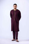 A rich maroon chiffon kurta, meticulously adorned with antique zardozi work along the neckline, enhanced by handcrafted custom buttons and a delicate chiffon lining. This exquisite ensemble is elegantly paired with korian raw silk pants, ensuring a seamless balance of style and comfort. Completing the ensemble is a cotton patka featuring an embroidered border and charming tassels, adding a touch of timeless elegance to this exceptional outfit tussles.