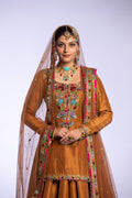 Introducing our enchanting outfit that exudes timeless elegance! The short shirt, crafted in a rich brown raw silk, pays homage to old-school charm with its resham work on the neckline and sleeves. The shirt is adorned with a captivating booti spray all over, adding a touch of allure and sophistication. Accompanying the shirt is a mesmerizing brown raw silk lehenga. It features our signature lappa gotta and multi-chata pati finish, creating a beautifully traditional and intricate design. To complete the ensemble, we have a stunning brown net dupatta. The dupatta boasts a four-sided border adorned with intricate zardozi work, complemented by delicate reham boti and sequence spray. The dupatta is finished with delicate metal and gotta detailing, adding a touch of opulence