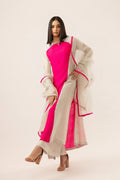 Description: A gracefully paneled dress, showcasing a harmonious blend of soft grey and delicate pink hues. This ensemble features stunningly embellished bootis adorned with a delightful mixture of multi-colored sitara and resham threads. Paired flawlessly with azar pants, this outfit exudes elegance and charm.